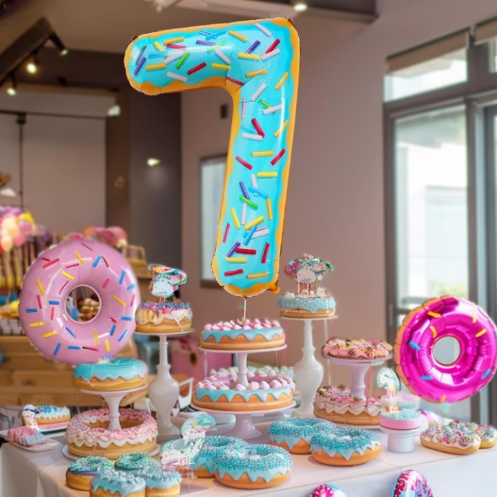Balon din Folie Metalizata Flippy, Figurina Cifra, Imprimeu Gogosi, Tema Aniversare 100 cm, Ambalaj Individual, Pai inclus, Umflare cu Aer sau Heliu, Multicolor, Cifra 7