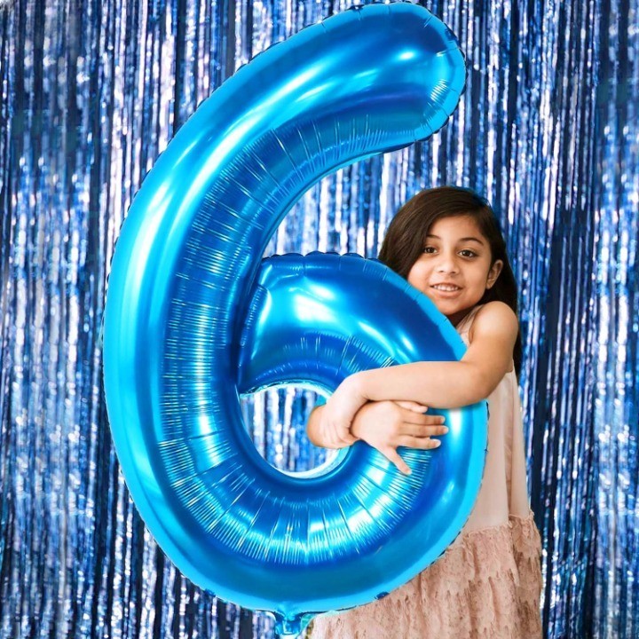 Balon din Folie Metalizata Flippy, Figurina Cifra, Tema Aniversare 100 cm, Ambalaj Individual, Pai inclus, Umflare cu Aer sau Heliu, Albastru, Cifra 6