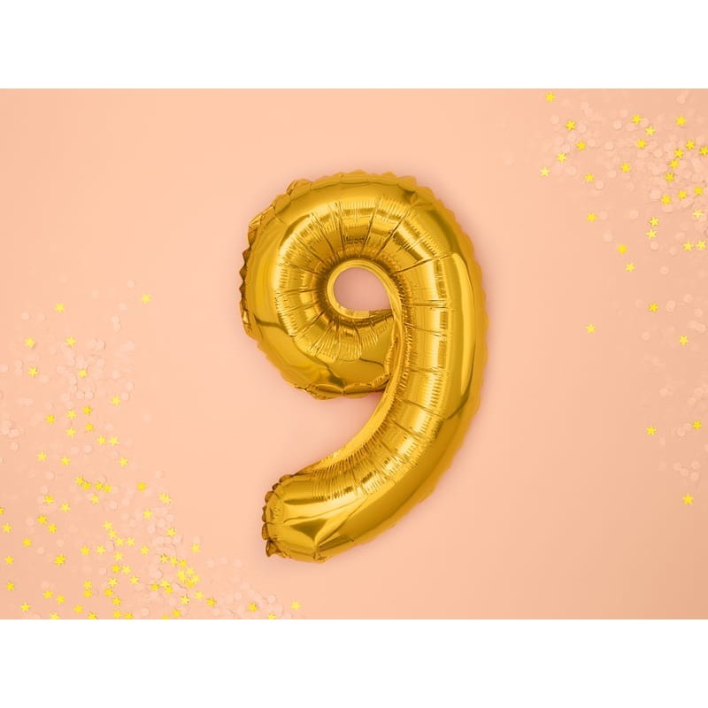 Balon din Folie Metalizata Flippy, Figurina Cifra, Tema Aniversare 100 cm, Ambalaj Individual, Pai inclus, Umflare cu Aer sau Heliu, Auriu, Cifra 9