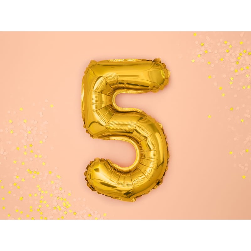 Balon din Folie Metalizata Flippy, Figurina Cifra, Tema Aniversare 80 cm, Ambalaj Individual, Pai inclus, Umflare cu Aer sau Heliu, Auriu, Cifra 5