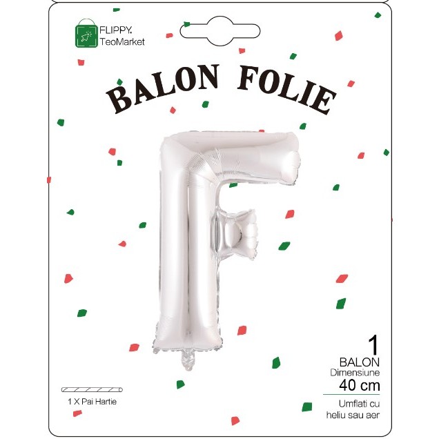Balon Folie Metalizata Litera F, Flippy, 40 cm, Umflati cu Heliu sau Aer, Ambalaj Individual, Pai inclus, Argintiu