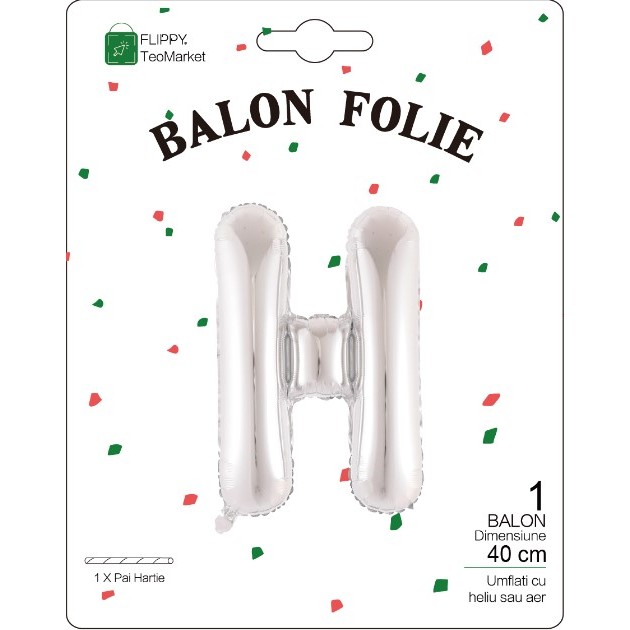 Balon Folie Metalizata Litera H, Flippy, 40 cm, Umflati cu Heliu sau Aer, Ambalaj Individual, Pai inclus, Argintiu