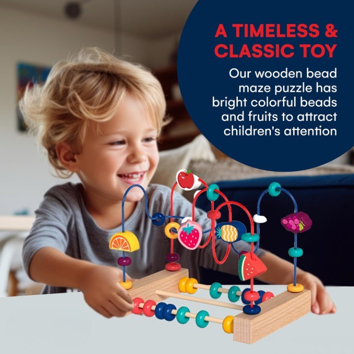 Descriere produs: Jucărie din lemn Montessori Flippy – Labirint motricitate cu abac și fructe