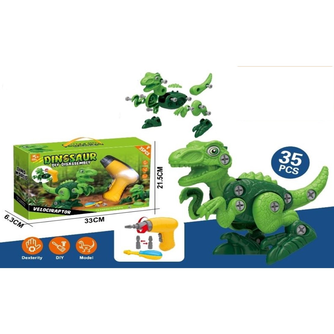 Jucarie pentru copii DIY 35 de piese dinozaur, asamblare si dezasamblare, interactiv, distractiv, accesorii incluse, cu bormasina, + 3 ani, verde
