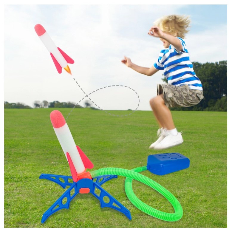 Jucarie distractiva de lansat rachete din burete cu ajutorului unei pedale pneumatice.