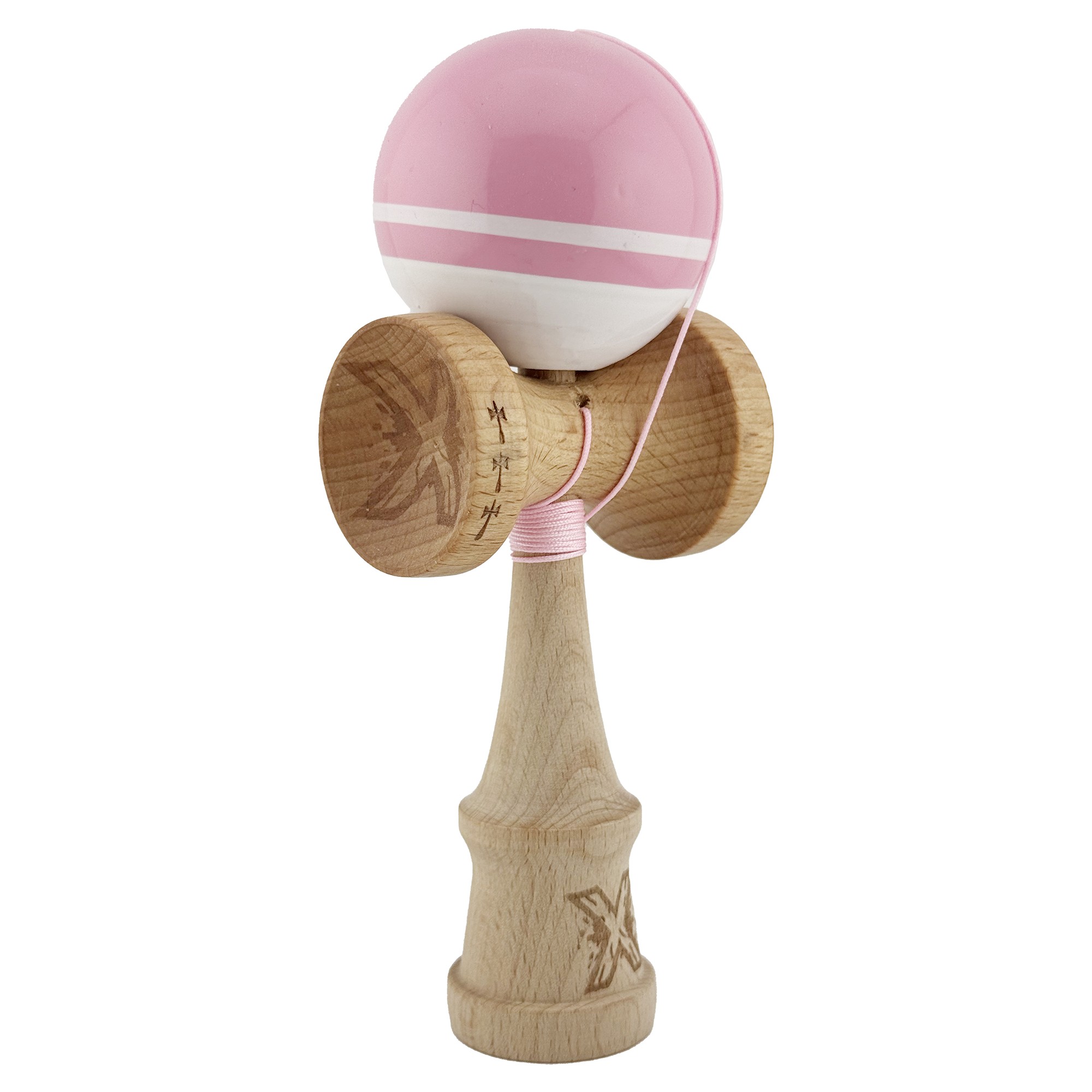 Kendama X Originala, Profesionala, Flippy, Big Cups V2, Super Sticky cu Cupe Mari, din lemn 18 cm, Rulment Metalic cu Ata 55 cm, Roz/Alb
