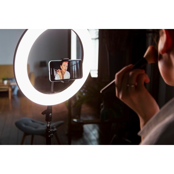 Structura inelară a lămpii permite iluminarea perfectă și uniformă a spațiului de lucru și a persoanelor sau obiectelor fotografiate.