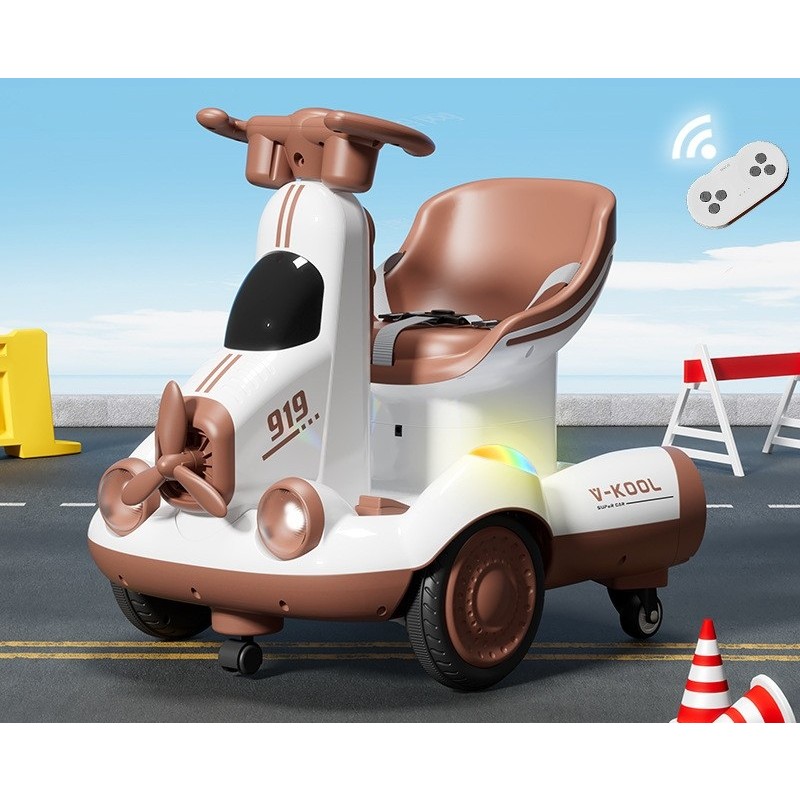Masinuta Electrica, Flippy, pe 4 Roti, cu Telecomanda, Lumini Led si Muzica, +2 ani, Inaltime Reglabila, Maro
