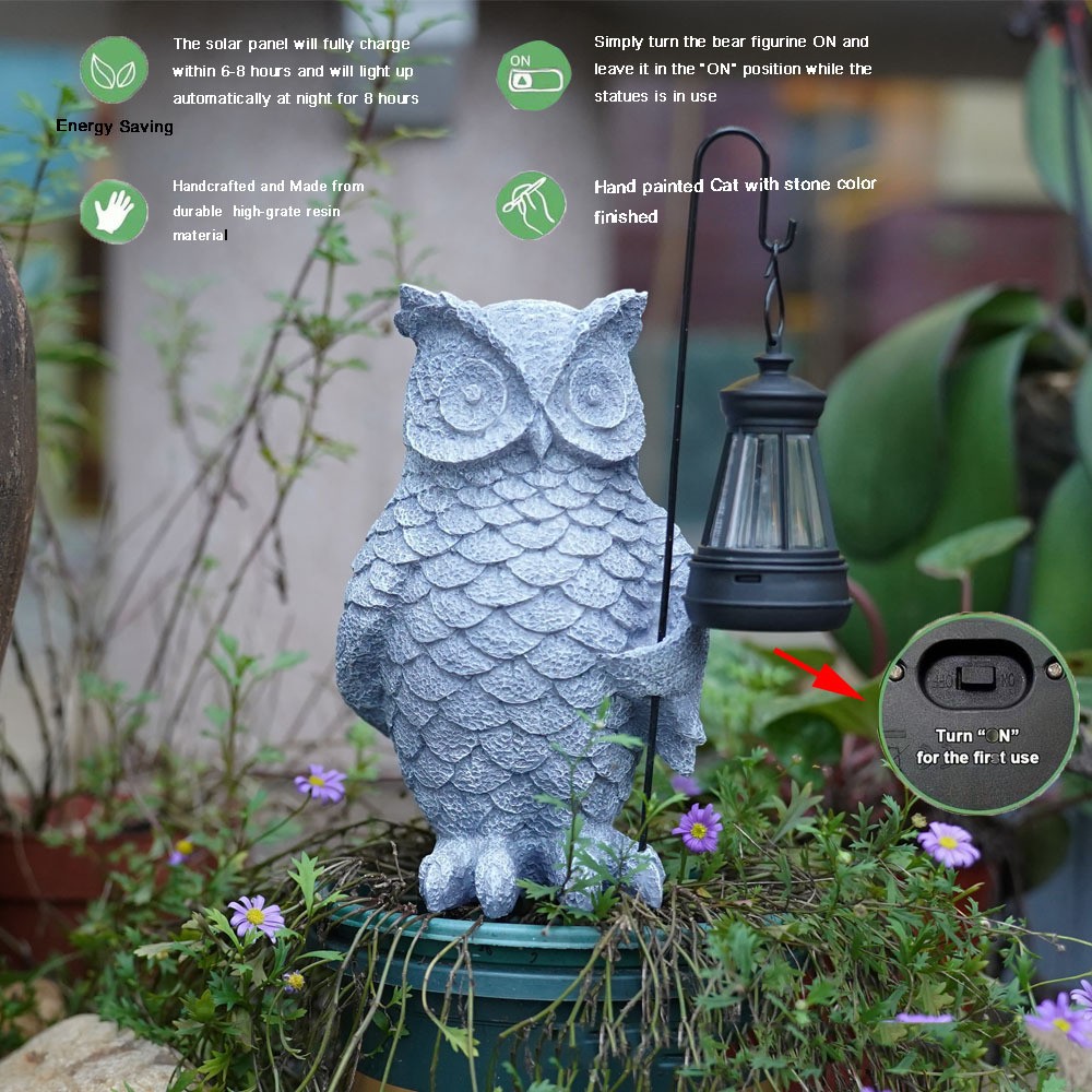 Ornament de Decor pentru Gradina cu LED, Flippy, Model Bufnita cu Felinar, Decoratiune Exterioara pentru Casa si Gradina, din Rasina, 21.5×15 cm, Gri