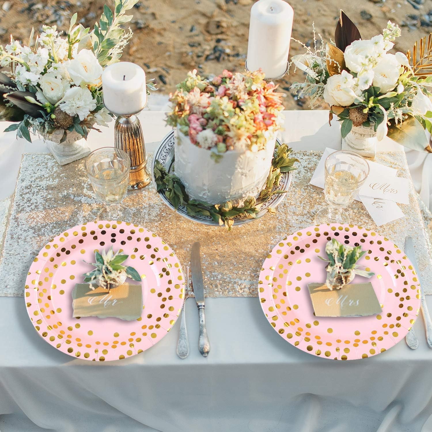 Set 10 Farfurii Unica Folosinta, Flippy, Imprimeu cu Buline, din Carton, Diametru 23 cm, Roz/Auriu