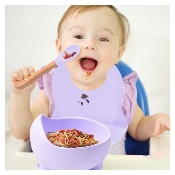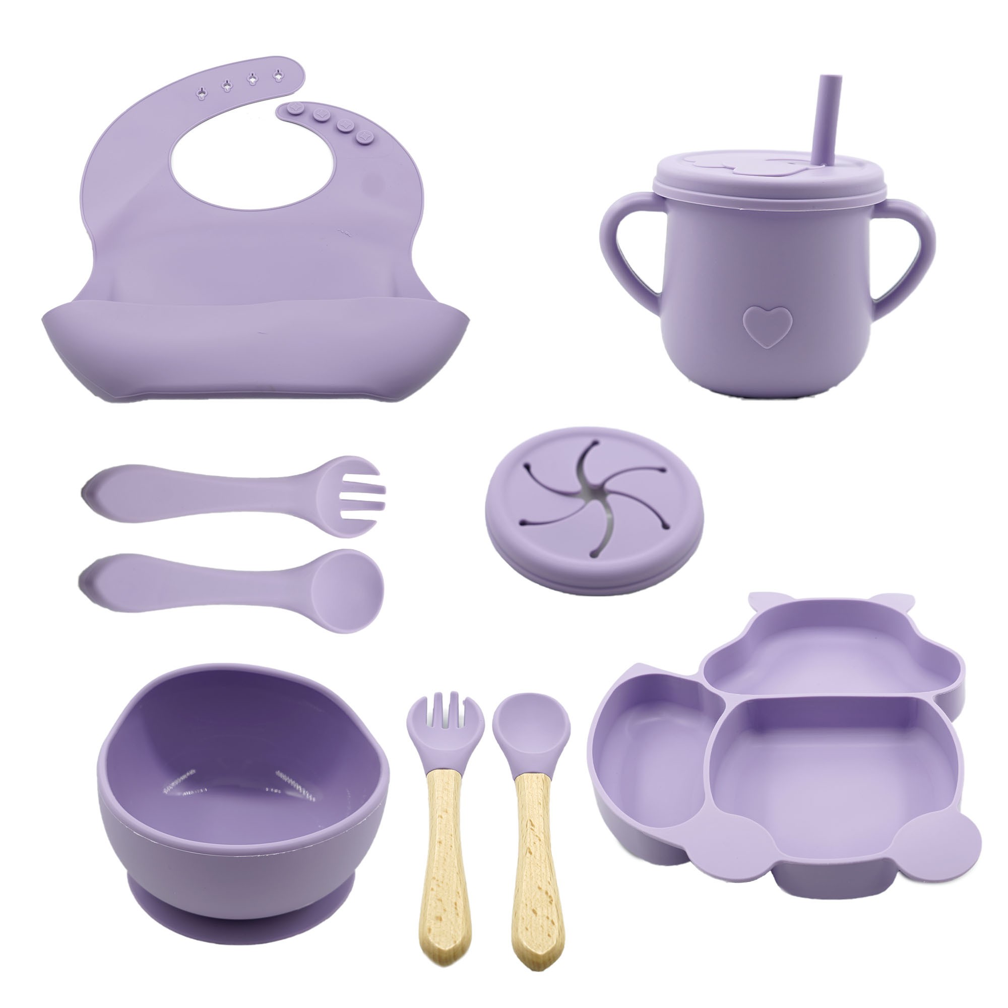 Set 10 piese diversificare bebelusi si copii din silicon Flippy, baveta, farfurie compartimentata cu ventuza, bol cu ventuza, tacamuri din lemn si silicon, cana pentru gustari, fara alergeni, mov