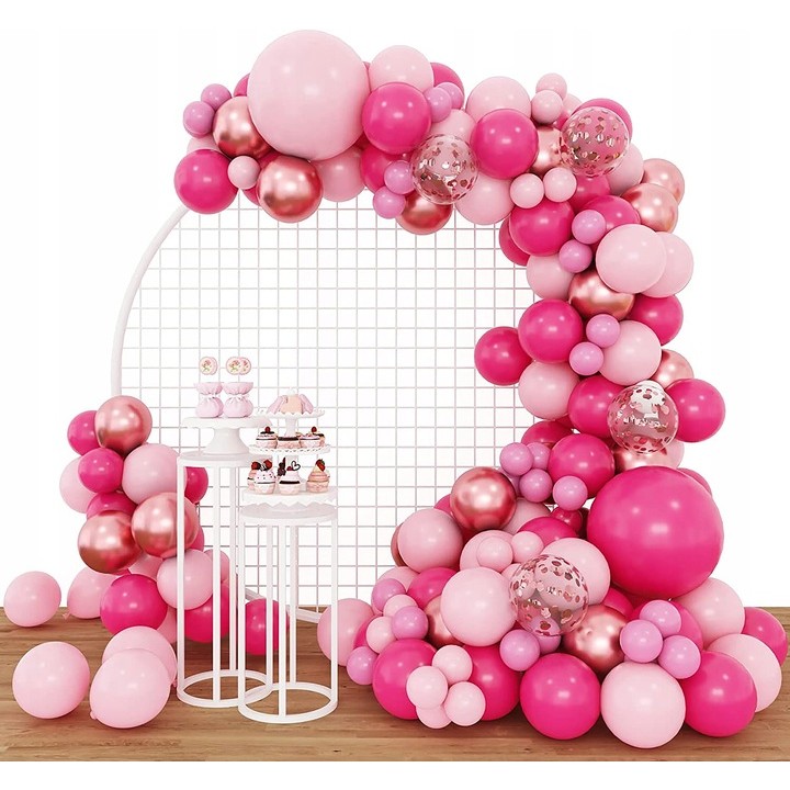 Set 126 Baloane din Latex, Flippy, Model Petrecere pentru Arcada, Baloane Party, 12 cm, 25 cm, 30 cm, 45 cm, Roz, Roz Pal, Gold
