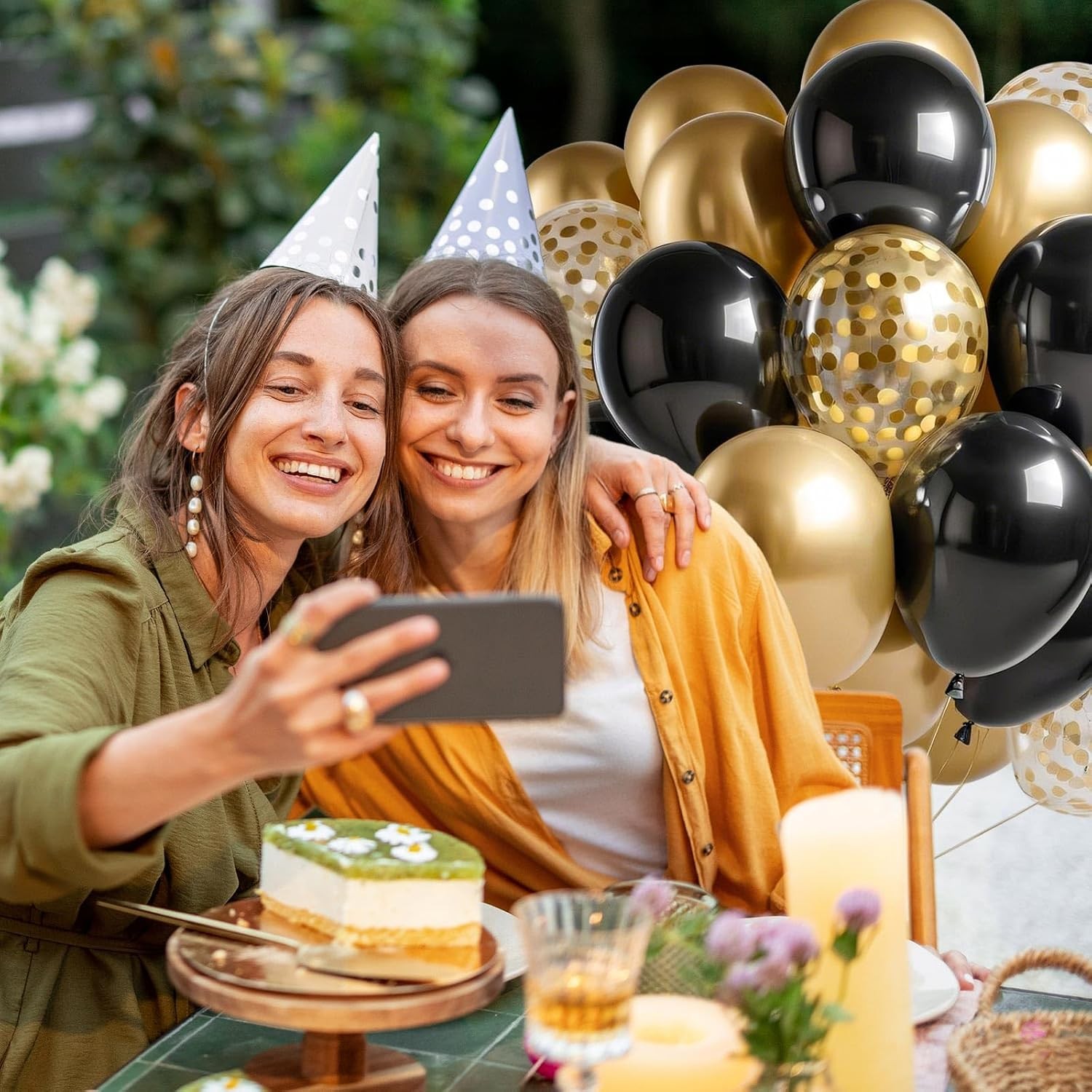 Set 16 Baloane din Latex, Flippy, Model Party, 30 cm, Auriu, Negru, Confetti, 2.8 g