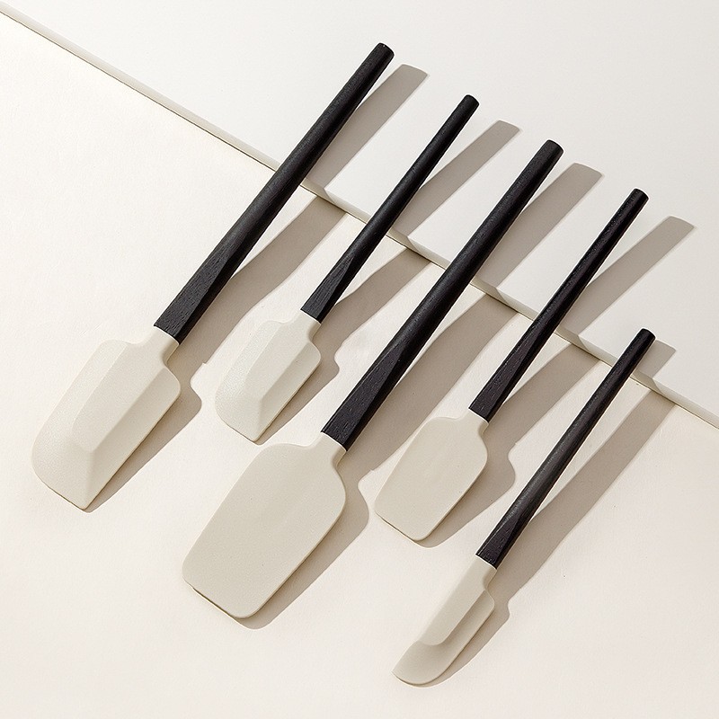 Set 5 Ustensile de Bucatarie, Flippy, din Silicon si Lemn, Spatule de Diferite Dimensiuni, Termorezistente, Antiaderente, Alb-Negru