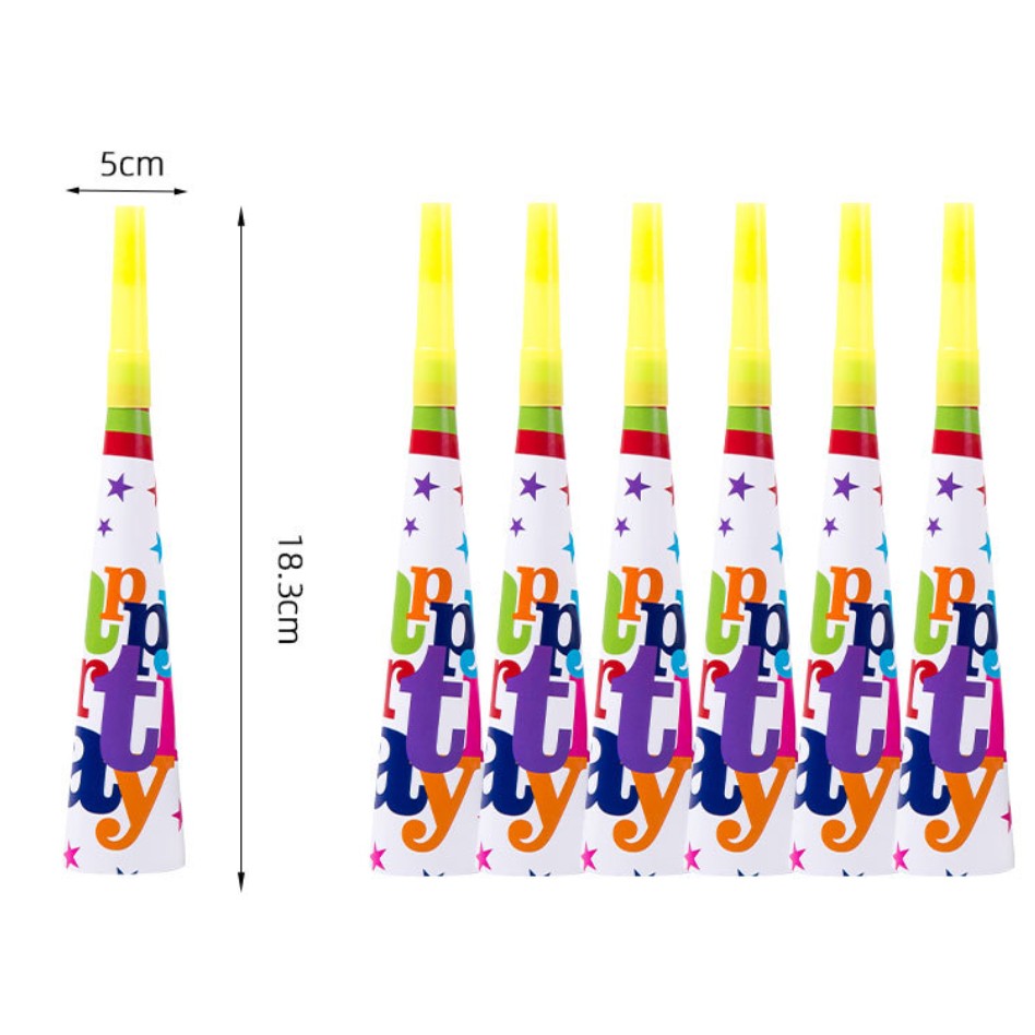 • Design Multicolor: Fiecare trompetă este decorată cu un design vibrant și plin de culoare, având inscripția „Happy Birthday”, aducând un plus de veselie oricărei petreceri de ziua de naștere.