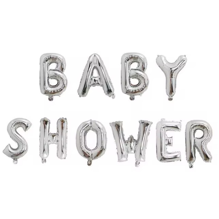 Set Baloane din Folie Metalizata, Flippy, Model Baby Shower, Litere de 40 cm, Baloane Party, Ambalaj Individual, Pai, Ata si Adeziv Incluse, Umflare cu Aer sau Heliu, Argintiu