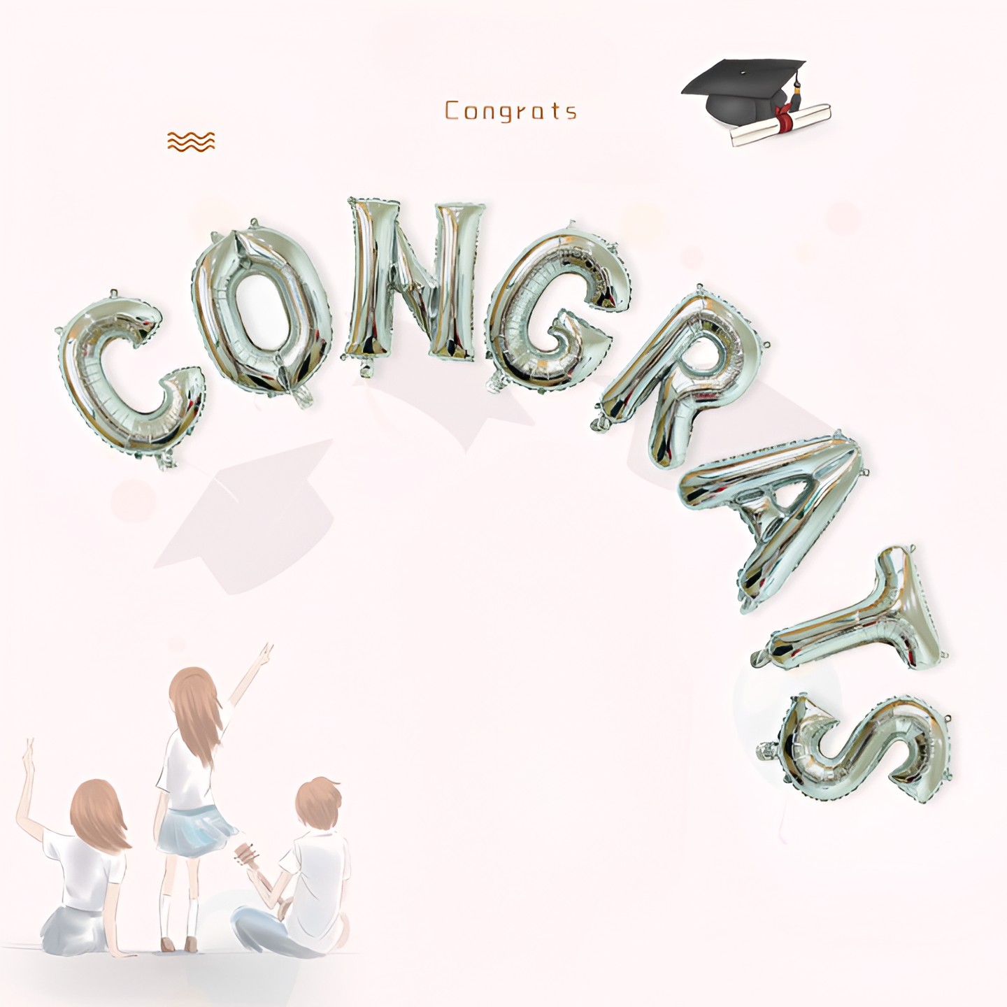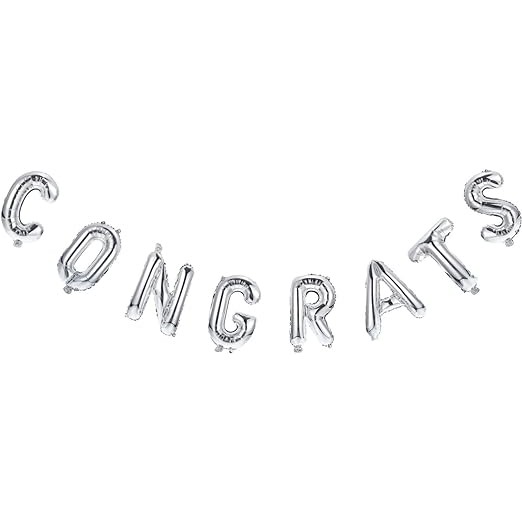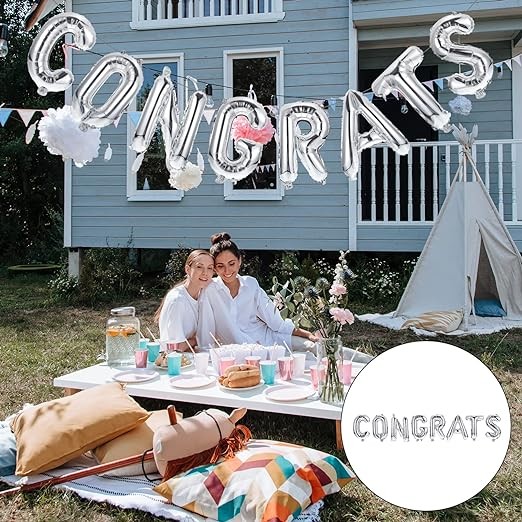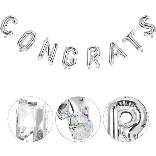 Set Baloane din Folie Metalizată, Flippy, Model Congrats, Litere de 40 cm, Baloane Absolvire, Ambalaj Individual, Pai inclus, Umflare cu Aer sau Heliu, Argintiu