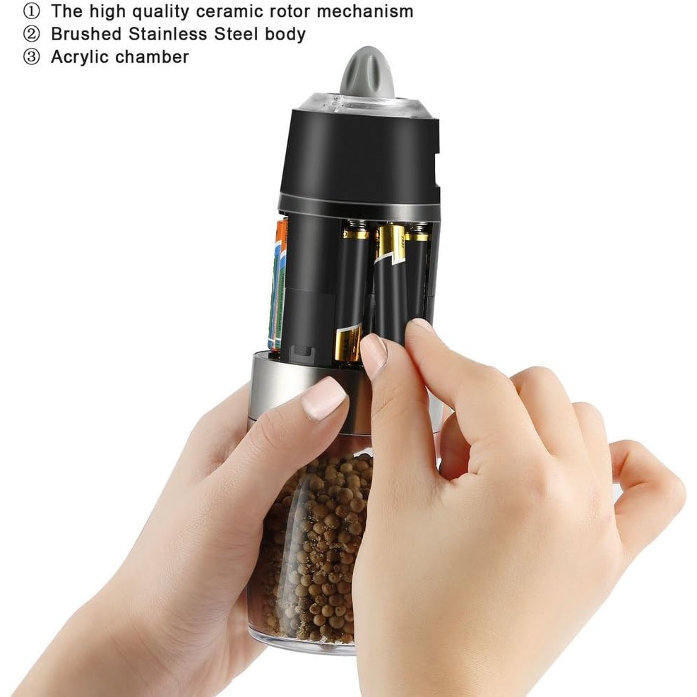 - Funcționare pe Baterii: Râșnița Flippy funcționează pe baterii, ceea ce o face extrem de convenabilă și ușor de utilizat. Nu mai trebuie să te îngrijorezi de cabluri sau prize – poți condimenta cu ușurință oricunde în bucătărie sau pe masă.