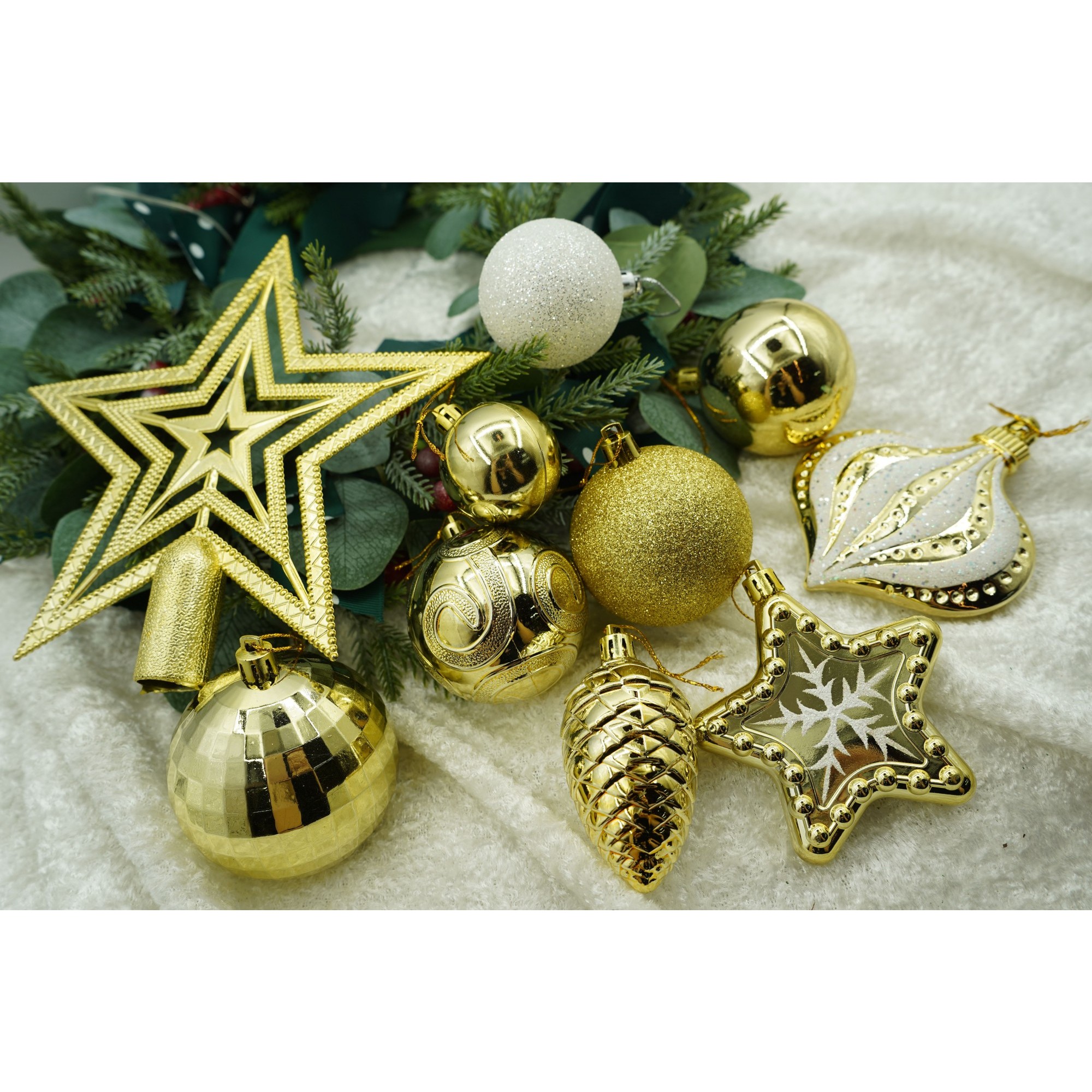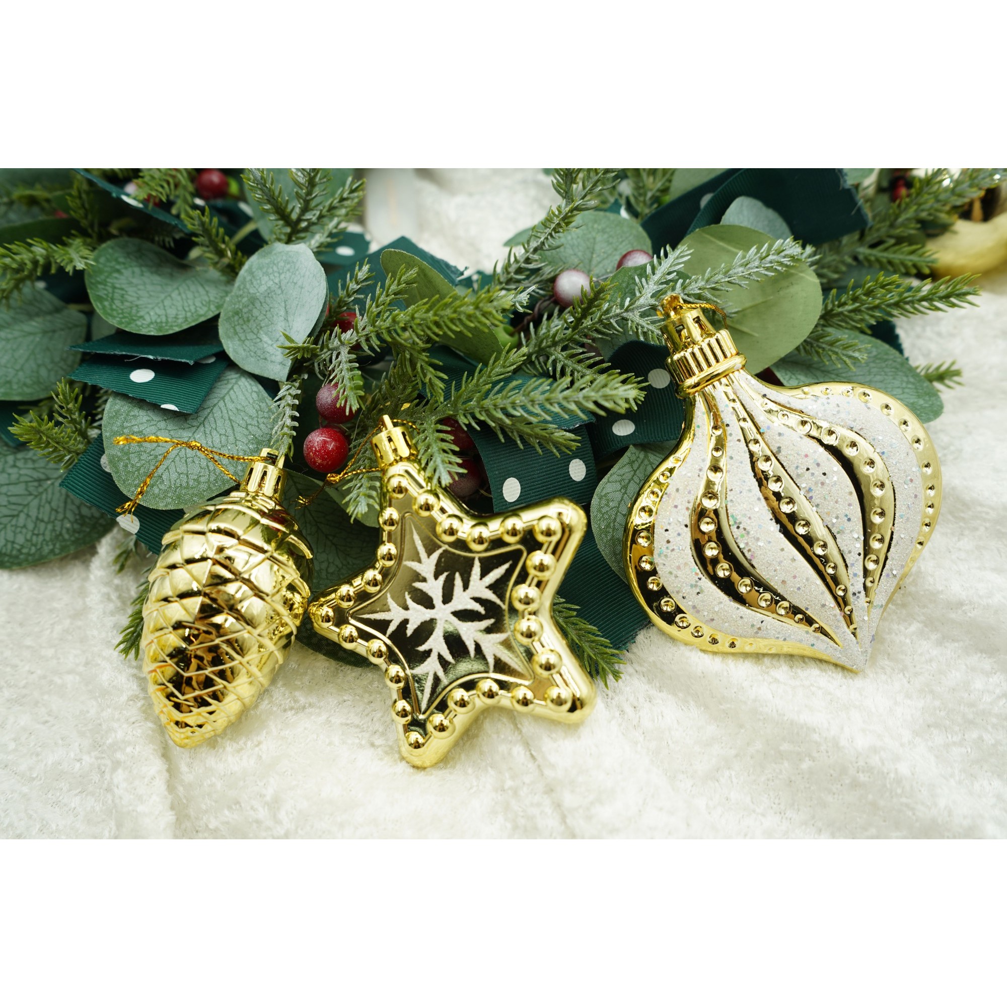 Set de 36 ornamente de brad, Flippy, de tip Glob, Auriu, din plastic, cu finisaj sclipitor , cutie 12 cm adancime x 24 cm inaltime x 18 cm lungime