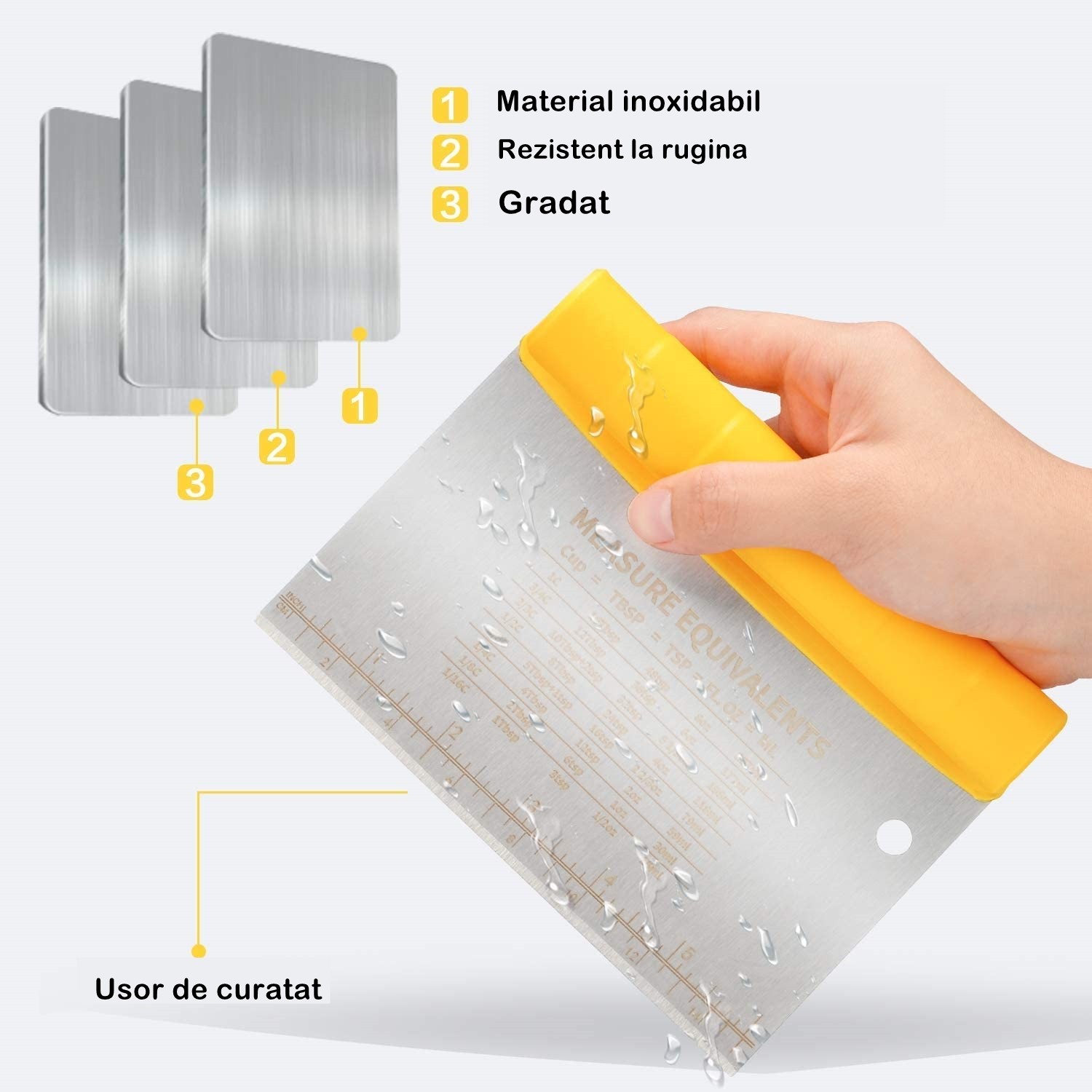 FuncÈ›ionalitate 2 în 1: Acest tăietor de aluat înglobează două funcÈ›ii esenÈ›iale într-un singur instrument: o lamă din oÈ›el inoxidabil pentru tăierea precisă a aluatului È™i o paletă din plastic pentru manevrarea uÈ™oară a aluatului sau a altor ingrediente. Astfel, economiseÈ™ti spaÈ›iu È™i ai tot ce ai nevoie într-un singur produs.